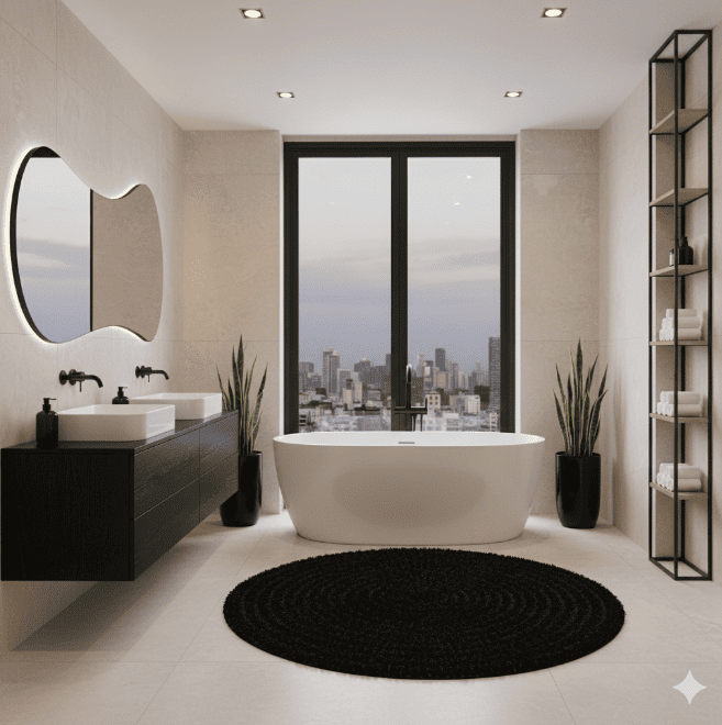 • Poti folosi alb pentru pereti si negru pentru detalii precum mobilier, robineti sau elemente decorative, pentru a crea echilibru si stil.