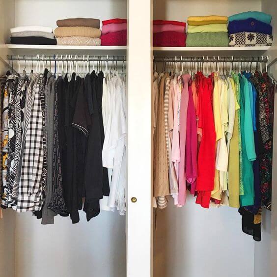 Daca pui mare pret pe imaginea ta si iti place ca hainele tale sa se asorteze, intotdeauna, intre ele, poti lua in considerare organizarea dressing-ului in functie de culori. Iti va fi mult mai usor, astfel, sa observi care articole se potrivesc intre ele, in special daca ai mai multe piese asemanatoare, la care difera foarte putin nuanta.