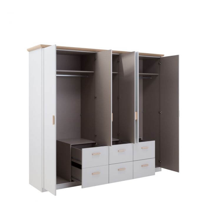 Dulapul Kolding este ideal pentru un cuplu ce detine haine din spectrul office ori elegant, avand un spatiu generos pentru agatarea umeraselor, dar si sertare pentru lenjeria intima sau alte articole.