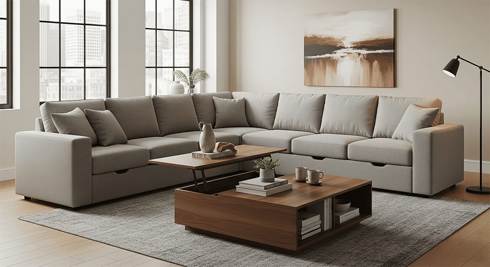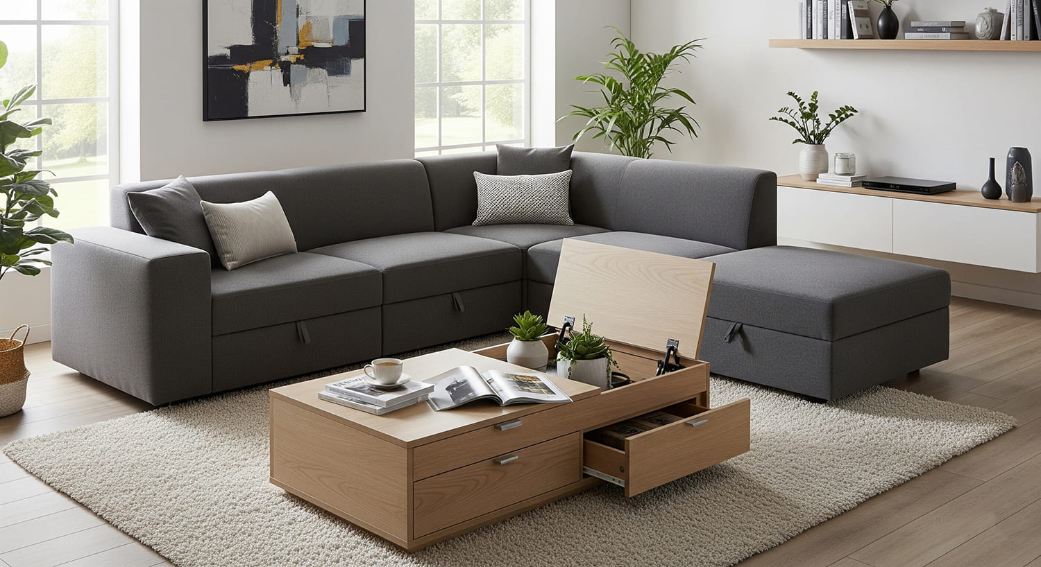 - Depozitare inteligenta: Foloseste coltar cu lada, mese de cafea multifunctionale, rafturi suspendate si solutii pentru spatii neconventionale.